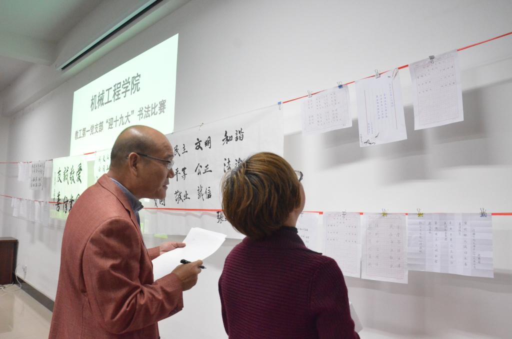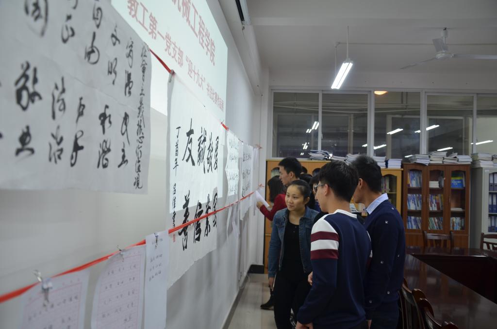 为迎接党的十九大胜利召开,10月17日,为期两周的机械工程学院教工一支部“喜迎十九大,培育和践行社会主义核心价值观”书法大赛作品展在巡天楼205举行。此次比赛邀请了校党办、校办、宣传部相关负责人以及学院领导担任评委。