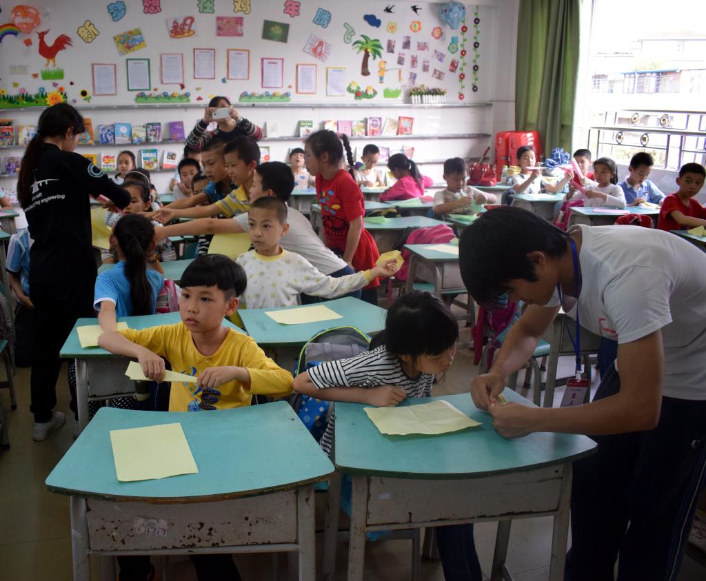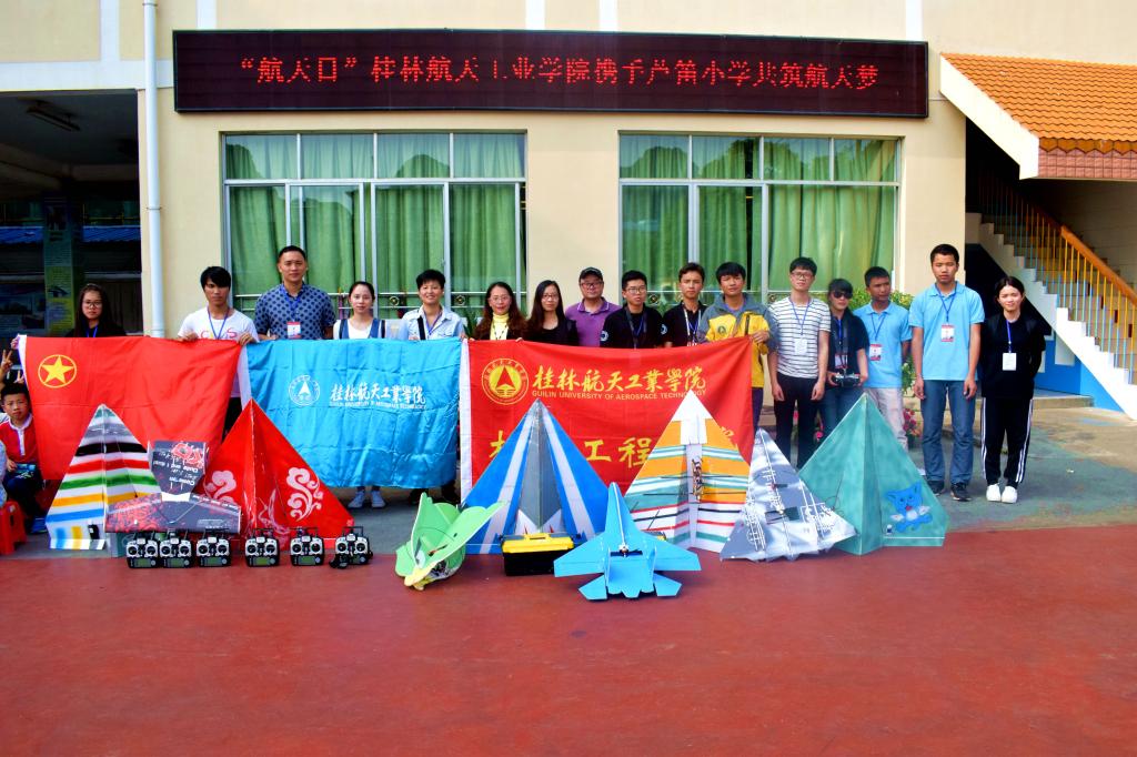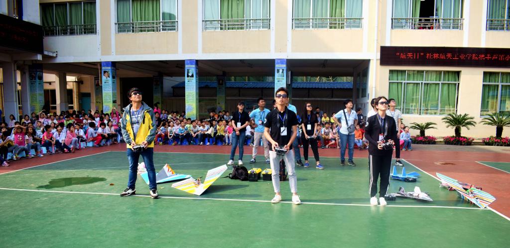 为迎接中国航天日的到来,响应校团委的号召,机械工程学院微小飞行器实验室航模表演队于20日下午到桂林市芦笛小学开展飞行表演活动,校团委综合科科长李中焘老师、院团委书记韦喆老师以及小朋友们观看了此次表演。