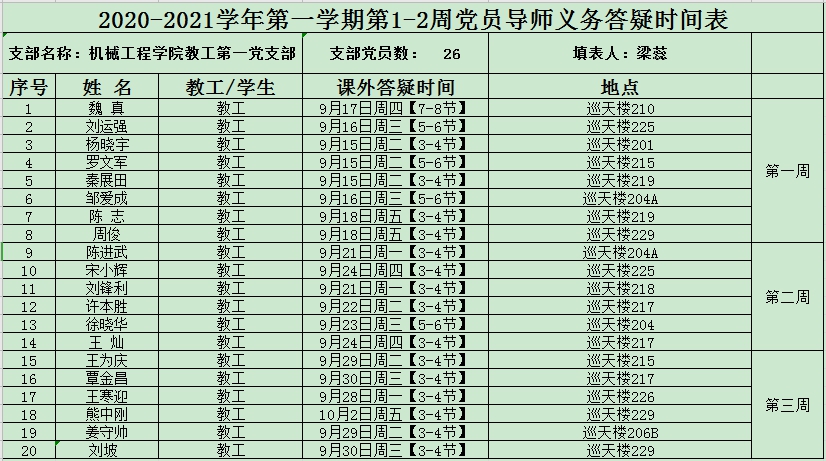2020-2021学年第一学期第1-2周党员导师义务答疑时间表