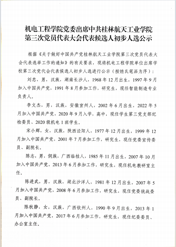 在线买世界杯平台党委出席中共在线买世界杯平台第三次党员代表大会代表候选人初步人选公示