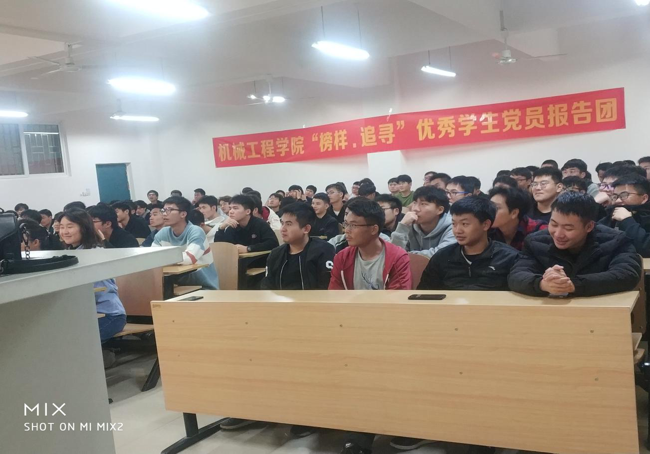 为加强学生的学习积极性,帮助学生牢固树立远大的理想信念。世界杯官网于2019年12月15日晚上19:00,先后在飞天楼213教室、208教室,举办“榜样、追寻”优秀学生党员报告会,出席本报告会有世界杯官网庞南霞老师和16级候丰尚优秀学生党员。18级机械设计制造及其自动化全体同学悉数参会。