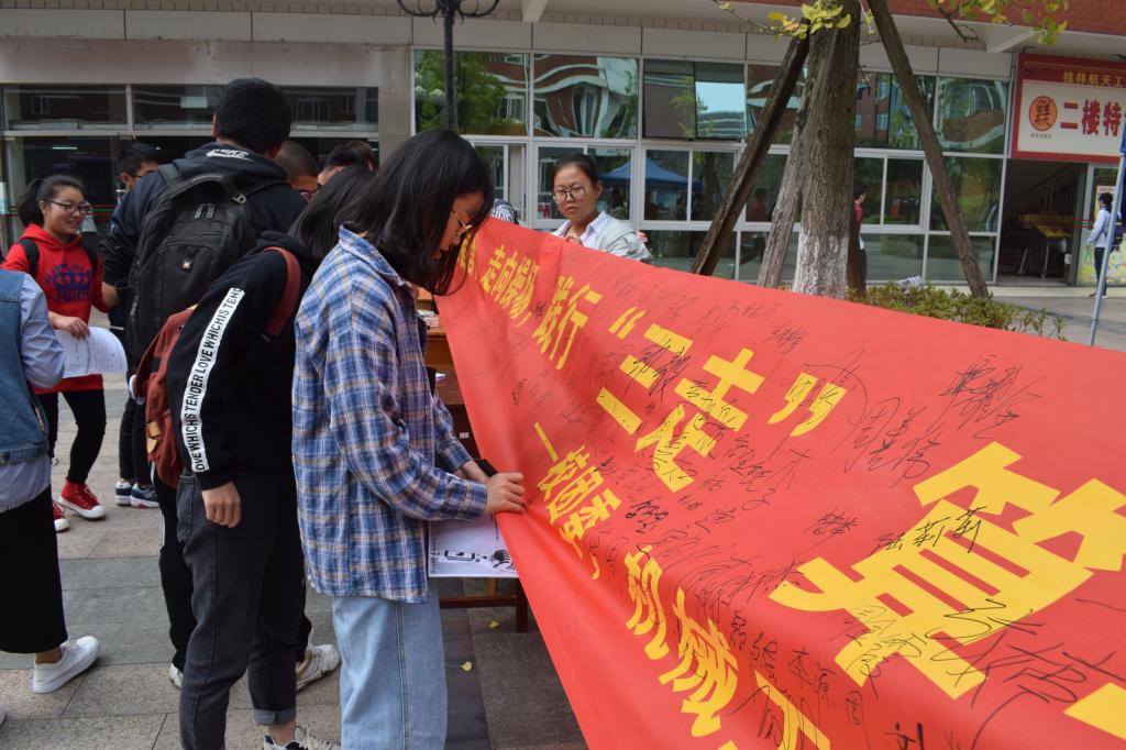 本次签名活动号召大家脱离网络的束缚,走向运动,享受青春。在活动现场,同学们在工作人员的指引下,纷纷在横幅上签下自己的名字。这不仅是对“三走”活动期待与祝福,更是对“三走”活动的积极响应。同学们在暂离网络,走向运动后能更有助于体现青年人特有的激情与活力,加深同学们之间的感情,也更有助于同学们享受这美好的青春。