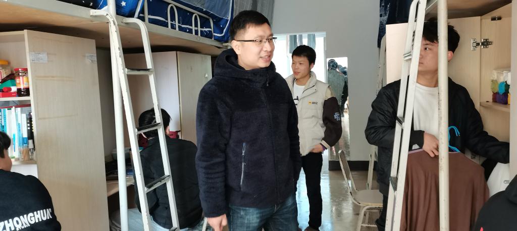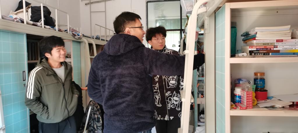 10:30,唐书记带领学院全体辅导员走入学生宿舍,共走访了天和苑1号楼、7号楼和8号楼。走访过程中,唐书记对同学们的宿舍卫生环境进行了细致地检查,并亲切地与学生交谈,了解他们近期的学习、生活情况,督促学生养成良好的作息习惯,营造良好的宿舍氛围。鼓励同学之间应团结友爱,相互督促,共同进步。唐书记还细心叮嘱同学们要注意用电安全、财产安全和出行安全,并特别强调目前全国疫情依旧严峻,督促学生要做好个人安全防护,在寒假返乡途中要佩戴口罩,尽量减少与其他人员交流,避免聚集,与同乘者尽量保持距离;寒假期间要少外出、少聚集,不前往中高风险地区。