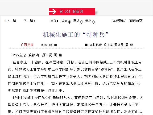 野外工程施工受自然条件影响非常大。高速铁路穿山跨河,经过地区地形多变,大型设备上不去,怎么开挖、竖杆?高海拔、高寒地区千年冻土,让普通机械水土不服,如何应对更高施工要求?特种工程装备研究应用前沿针对能源采掘、冶金矿山以及电网、高铁等基础工程等领域的关键技术需求。“通过我们的研究,目的是增加复杂地形情况下工程机械化作业水平,降低劳动投入成本和管理风险,提高劳动效率,增加经济效益,同时减少降低对农田、草地等植被资源的损耗,进而保护绿水青山,创造发展与环境和谐的社会效益。”刘忠介绍说,目前团队正进行硬岩液压钻进装备关键技术研究、电网山地施工特种运输装备研究与开发、液压凿岩冲击凿入系统波动力学研究与应用、适用于高海拔山区机械化施工的复合地基微型钢管桩基础设计施工技术及小型设备研究等国家省部级重要课题科技攻关,他们所开发各种多功能钻机、山地潜孔钻机、自行式轻便钻机、高原型机动双绞磨机、液压凿岩机等多款工程装备,服务于广西及周边地区地质勘探、国家电网网联工程线路基础施工中,对高原硬岩、沉积岩及冻土基础钻凿施工产生重要作用,极大地提高了施工功效,减低了施工成本,减轻了高原地区工人的劳动强度,产生了巨大经济效益。