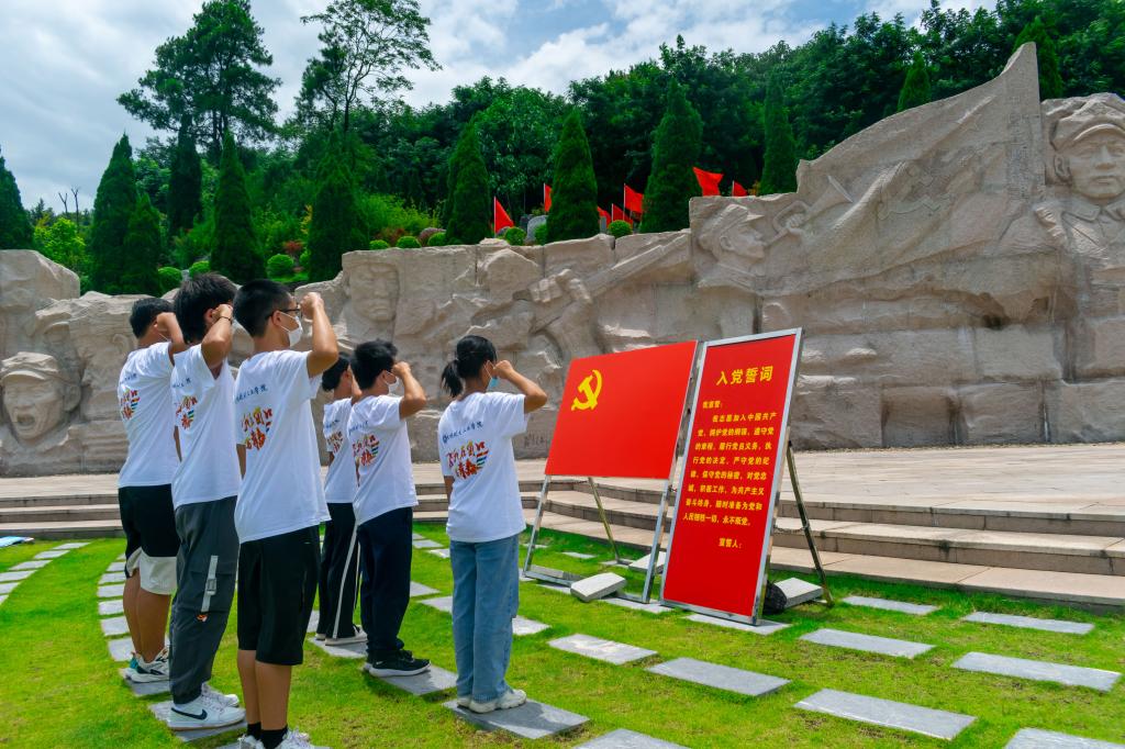 图为实践团成员在纪念园林浮雕前重温入党誓词