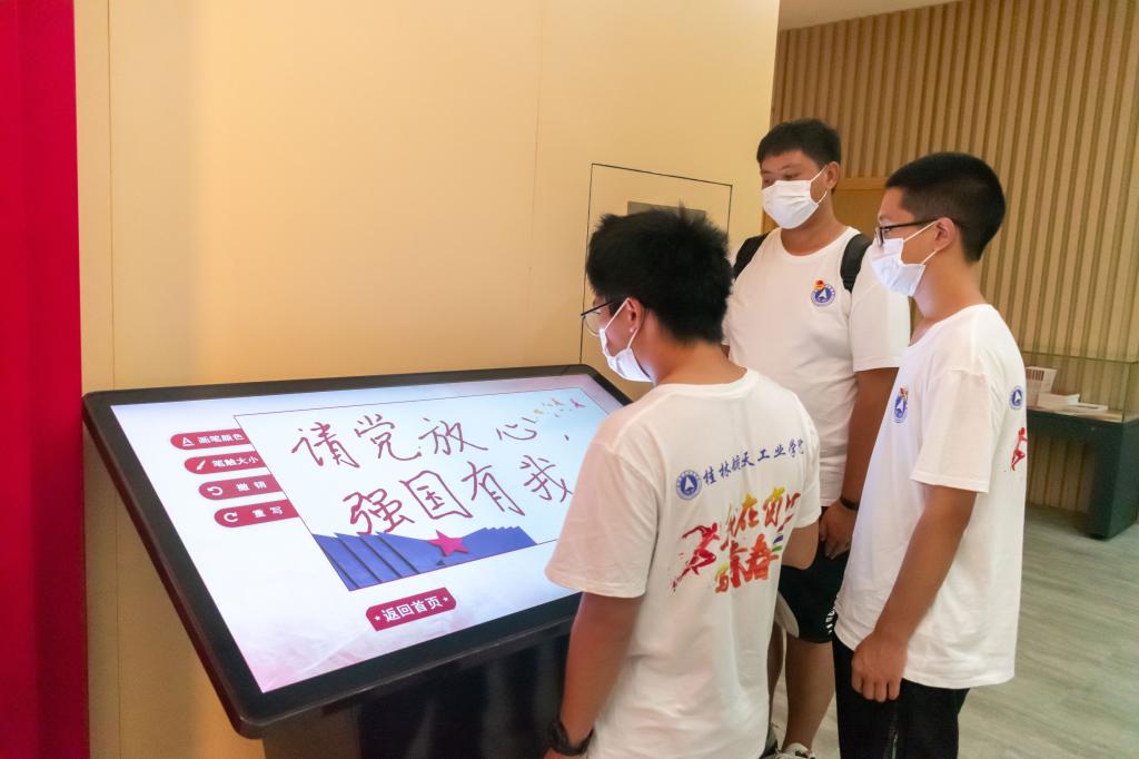 图为实践团成员在纪念馆内的电子屏幕前进行学习