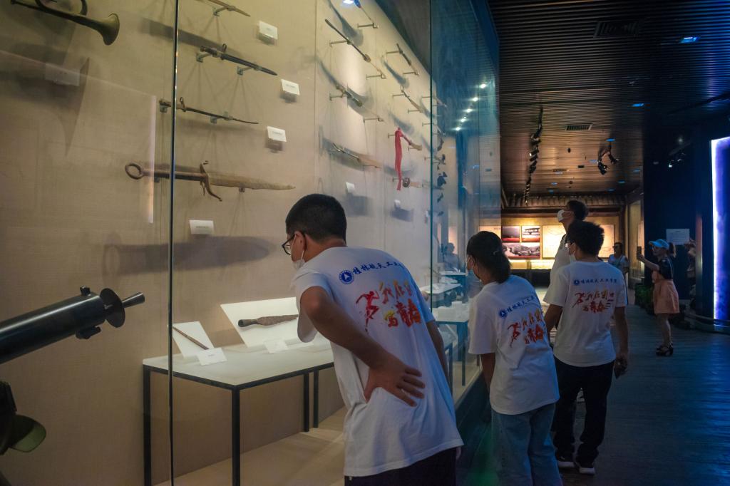 图为实践团队员在馆内观察了解战争中的兵器