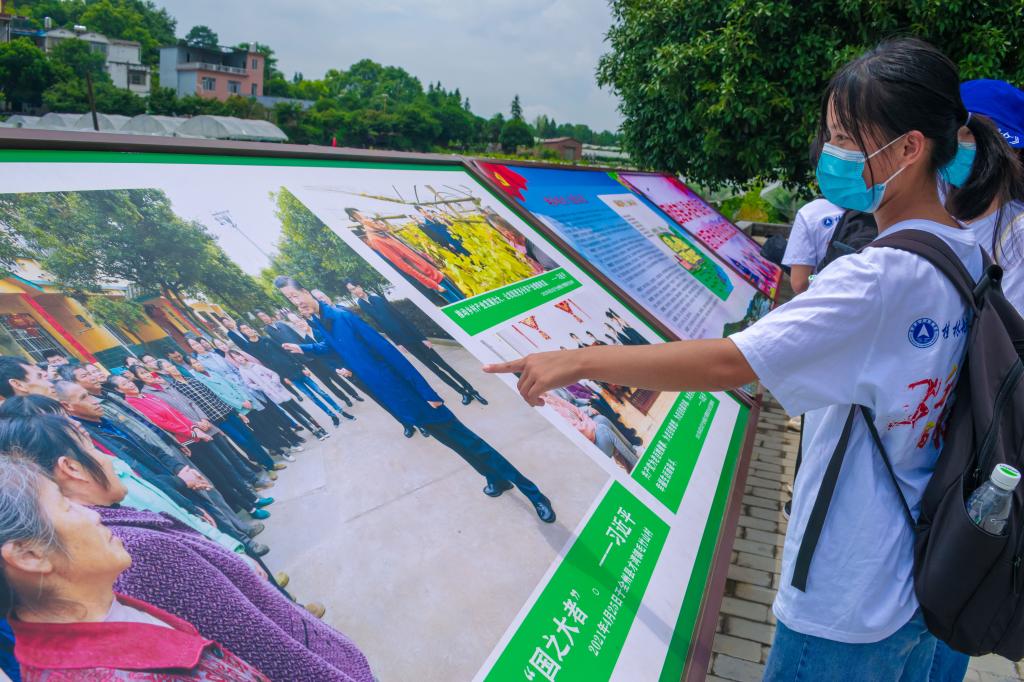 图为实践团队成员在村口观看习近平总书记来毛竹山村调研时的照片