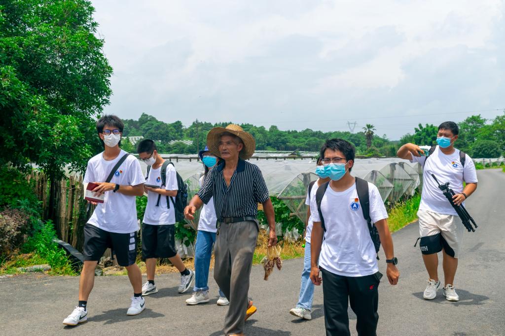 图为实践团队成员和王世龙爷爷走在小道上