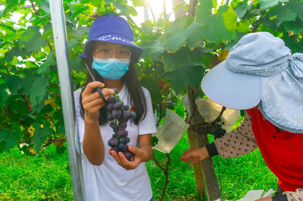 图为实践成员采摘刚成熟的葡萄