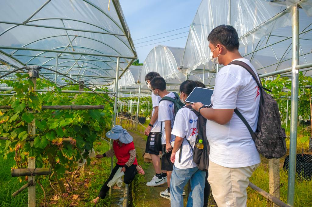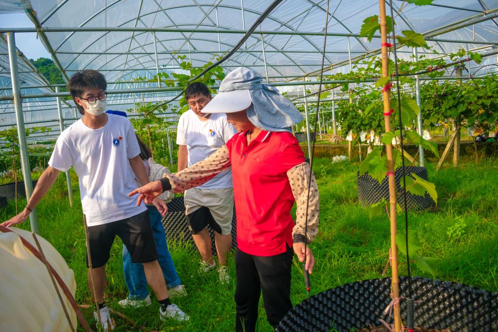 图为蒋军秀带领实践成员走进葡萄基地