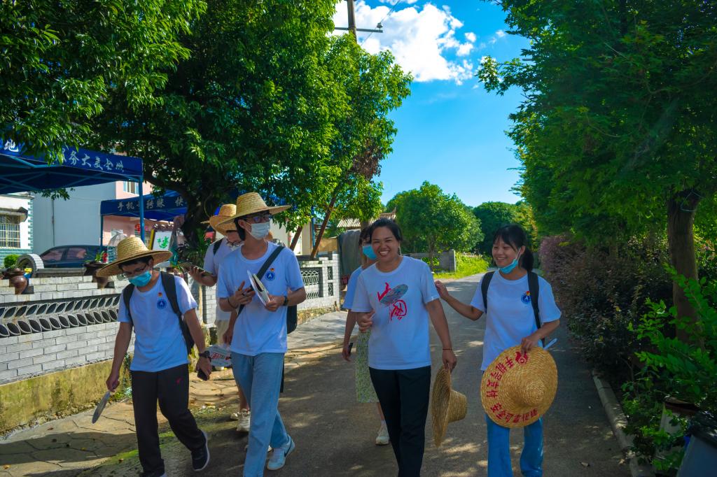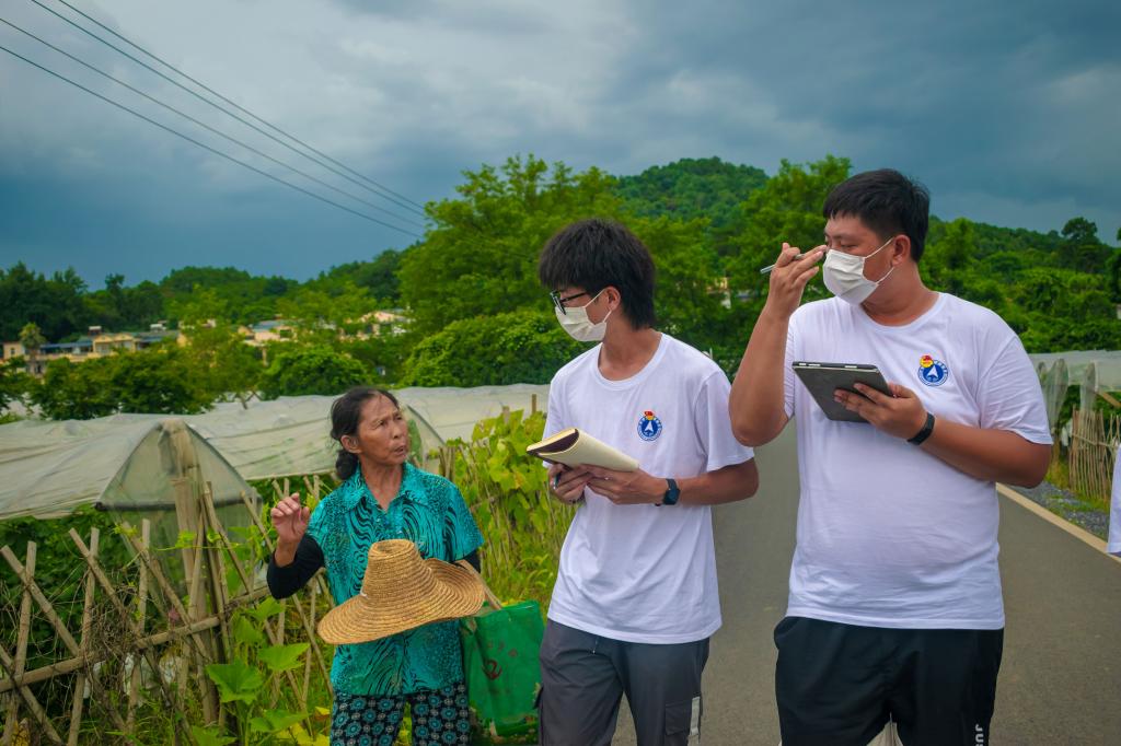 图为陈云秀和实践成员谈论村里的发展变化