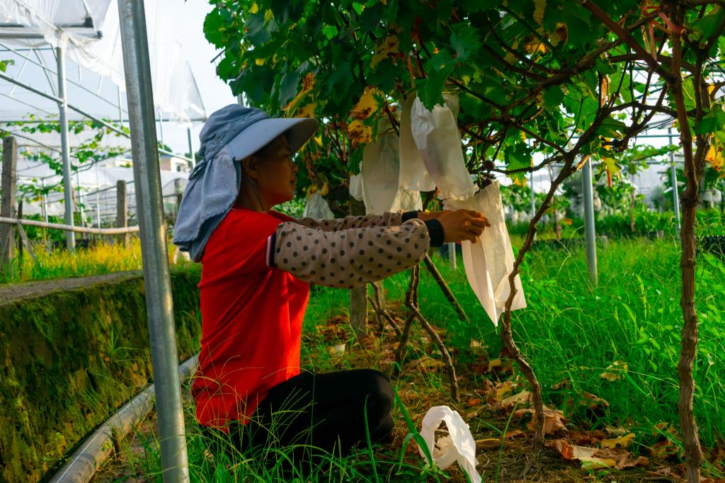 图为蒋军秀为葡萄套袋