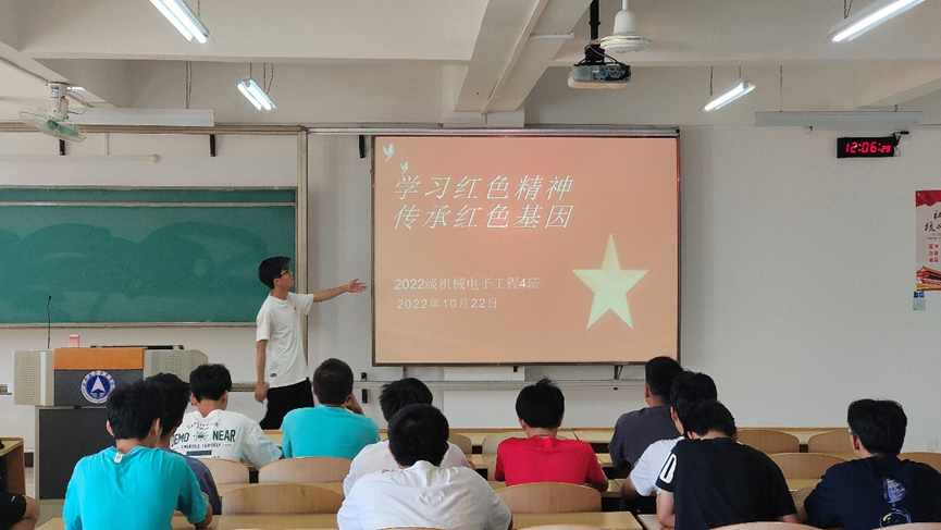 (图为2022级机电4班团支部开展“学习红色精神,传承红色基因”主题班会的活动照)