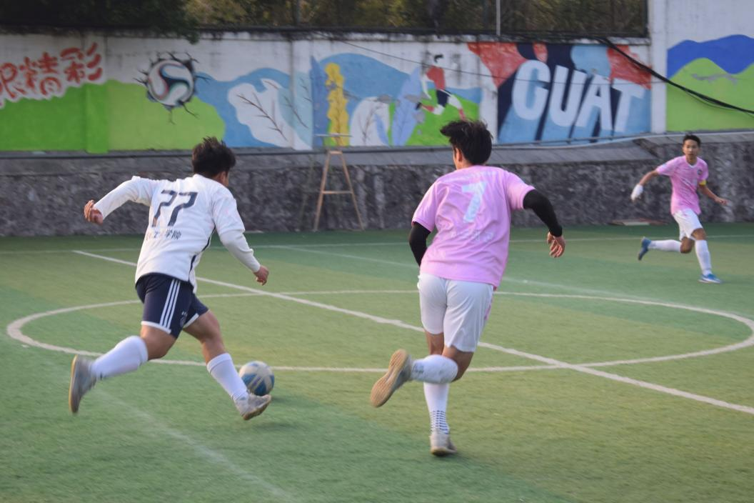赛场上,双方球员们奋力拼抢,你来我往,不甘示弱。足球在草地上不断穿梭,双方队员都在竭尽全力争取控球权。对方的防线在不断地收缩,试图阻止任何可能的进攻,而我方则试图突破这道铁壁,争取每一次进球的机会。比赛精彩画面层出不穷,每一次跑位、每一次射门都点燃着场内外球员和师生们的热情,欢呼声、喝彩声响彻赛场。