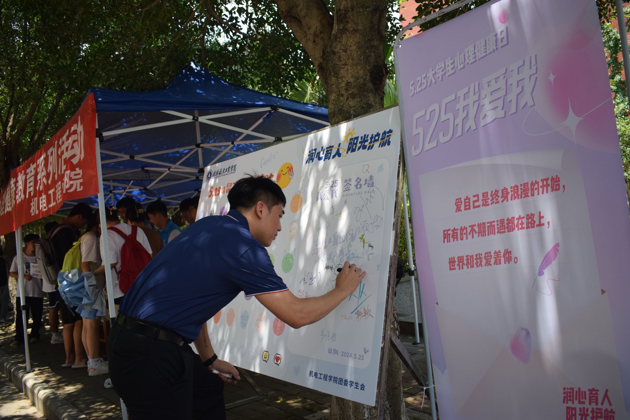 活动现场展现出许多温馨的瞬间,师生们在展板上绘上灿烂的笑脸,在签名墙上留下了自己的名字。学院为参与活动的师生准备了宣传心理健康知识的精美书签、贺卡等精美小礼品。学院党委书记谢雄辉、副书记马世文参与活动,先后在展板上绘画与签名,并鼓励大家关爱自己,以积极乐观的心态面对学习和生活。