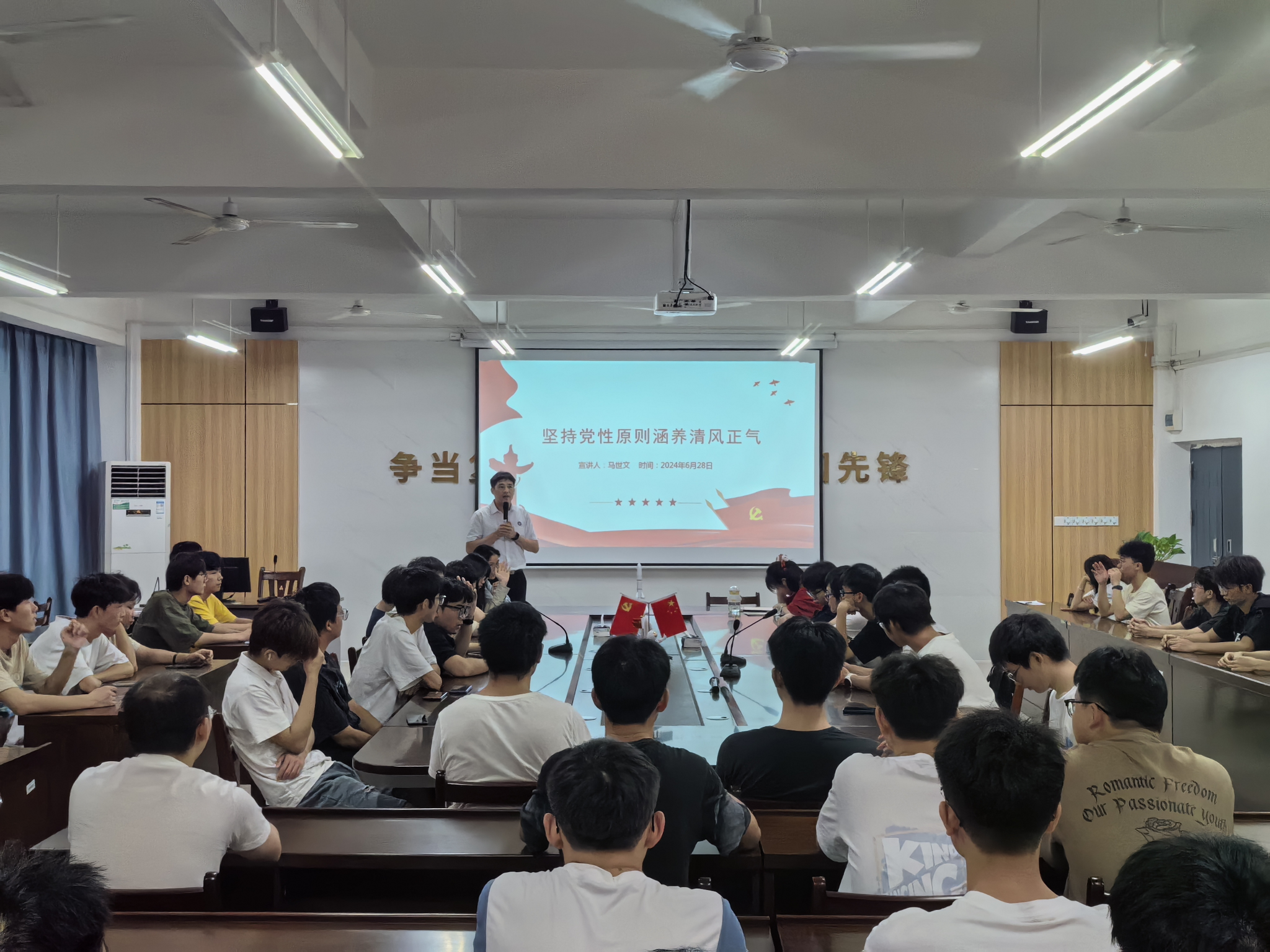 为引导党员干部深刻认识到坚持党性原则的重大意义,积极涵养清风正气,以实际行动推动全面从严治党向纵深发展,6月28日,在线买世界杯平台于巡天楼229会议室召开“坚持党性原则涵养清风正气”的讲座。本次讲座由在线买世界杯平台党委副书记马世文主讲,各年级党员代表参加聆听。