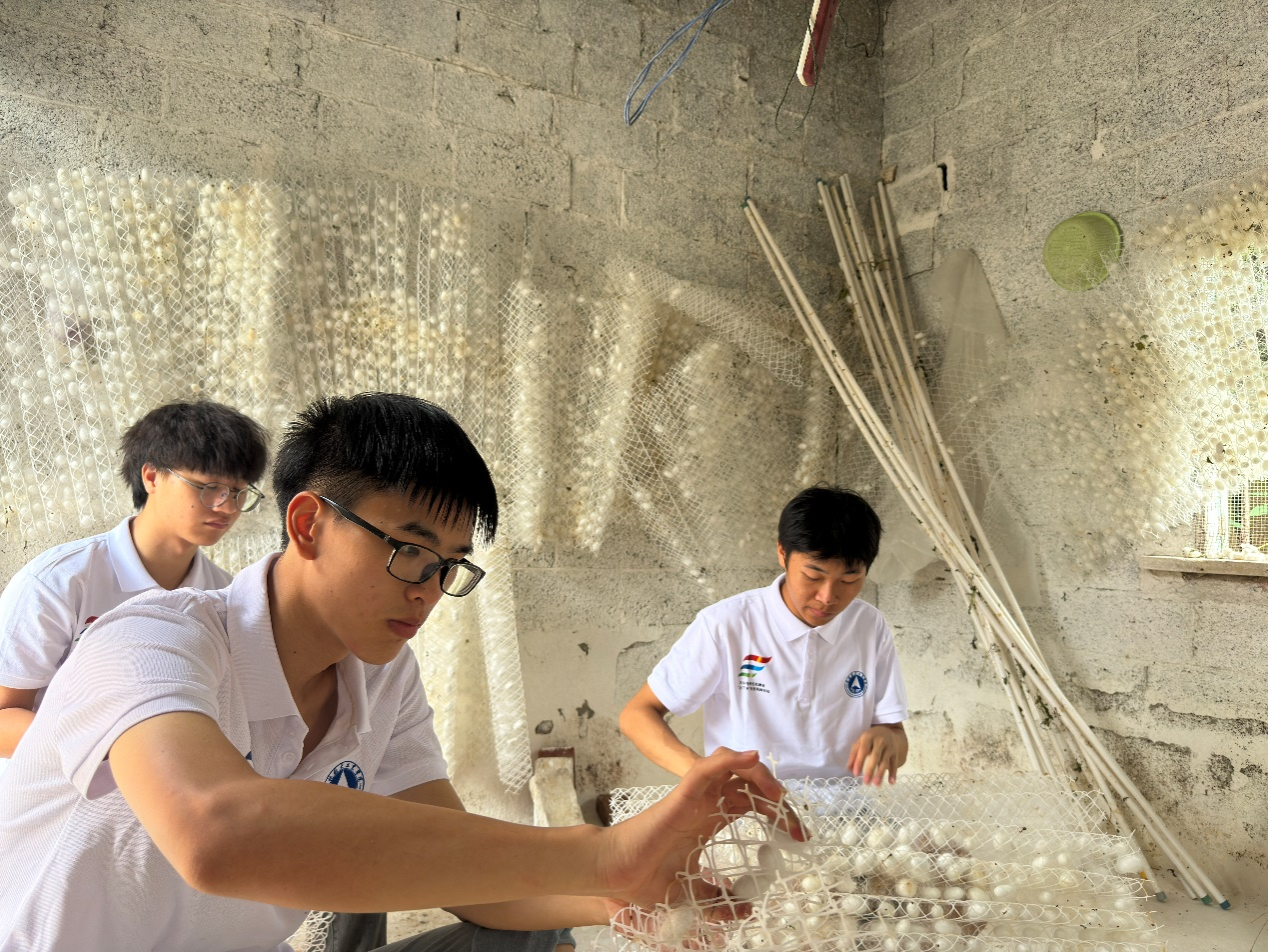 随后,实践团成员跟随着农户来到堆积着茧房的房间。在农户的教导下,实践团成员学会如何茧房中挑选并采摘优质的茧。实践团成员和农户一起将优质茧采摘出来。