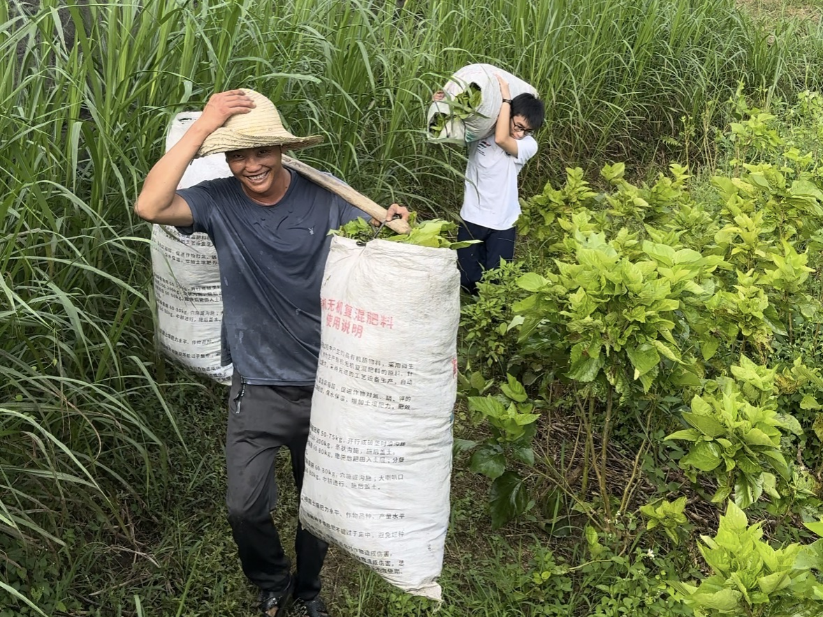 图3 实践队成员和养蚕户将采摘好的桑叶背回养蚕户的家中