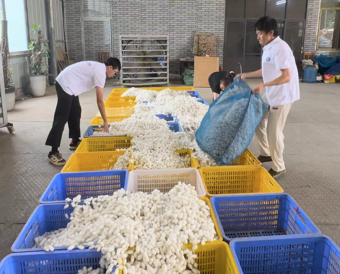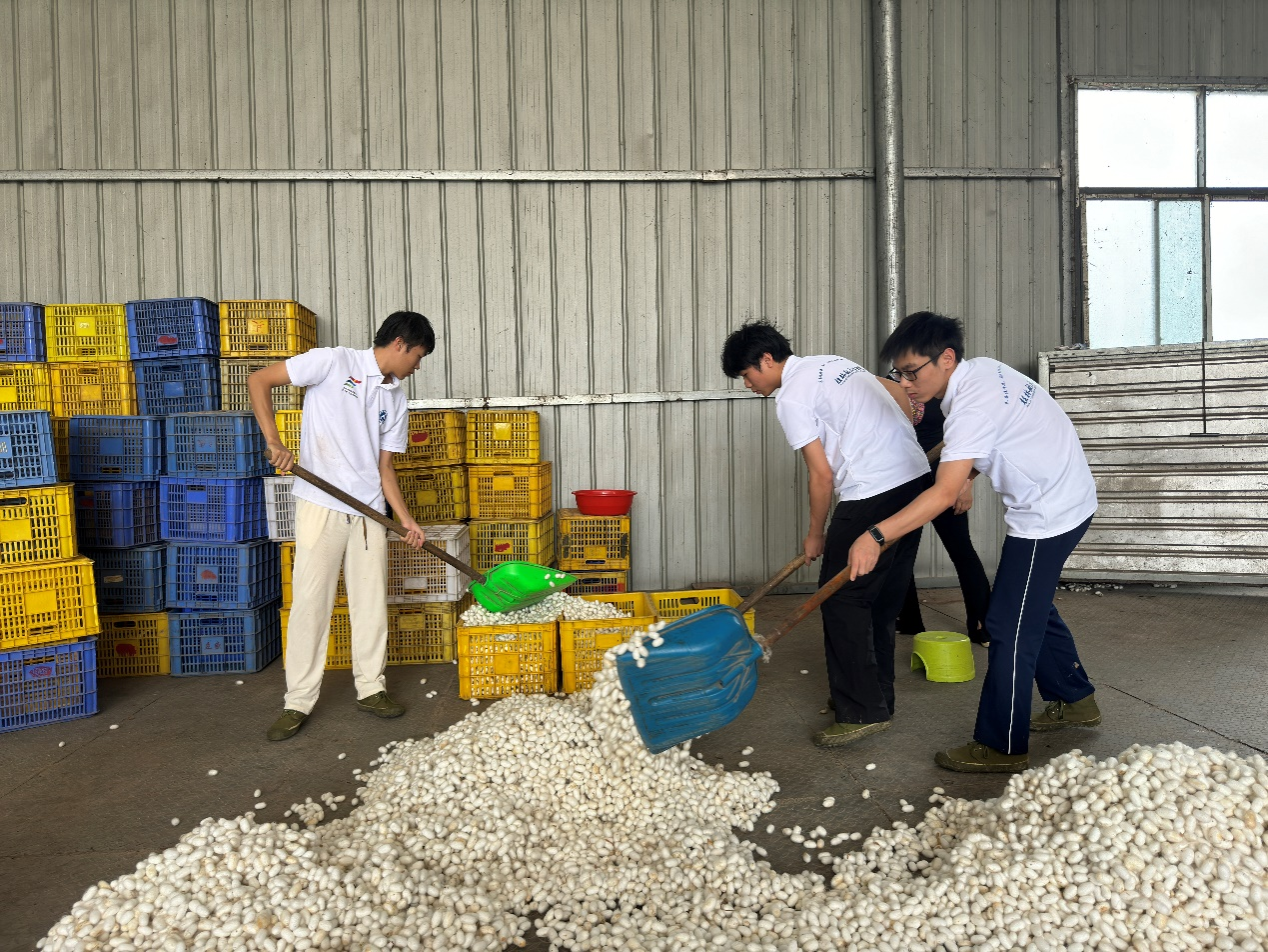 早上,实践团成员来到收茧站。在工厂人员的指导下,实践队成员学会了辨别优质茧,应该具有洁白的颜色和匀整的形状。随后实践队成员帮助工厂人员挑选出优质茧。