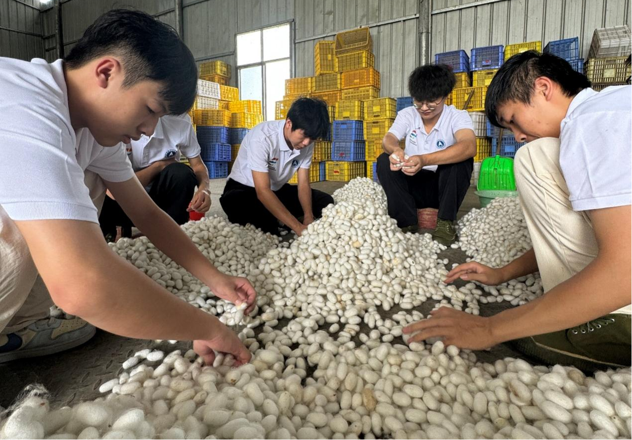 柳城县先后实施“国家‘东蚕西移’工程桑蚕基地建设”、“桑蚕优质高效种养及深加工集成应用示范”、“广西桑蚕标准园建设”等一系列项目,在全县种桑养蚕重点乡镇都建立了示范基地的基础上,组织大学生亲身体验种桑养蚕生活,通过劳动实践提高大学生对桑蚕文化的了解,提高大学生吃苦耐劳精神的同时,点线面的推广和传播当地特色积极产业,更好的带动乡村振兴发展。