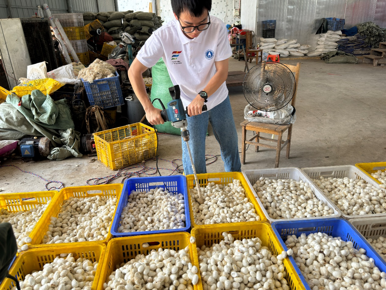 图5实践队成员用机器将外围蚕丝搅动脱离