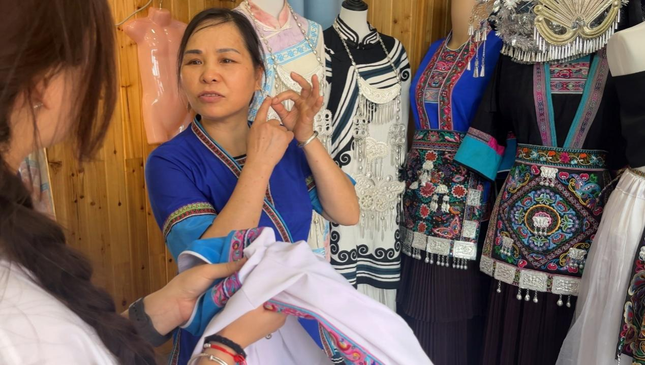 在调研过程中,实践团队还深入考察了侗绣与当地旅游业的结合情况。他们发现,程阳八寨景区内已开设有多家侗绣体验馆和服装租赁店,游客们可以在这里亲身体验侗绣的魅力并租赁侗族服饰拍照留念。店内多为侗族服饰,且分为两种,一种为传统侗族服饰,比较朴素,另一种为在传统侗族服饰上加以改进,在袖口等处绣上花边,显得更加地美丽大方。这些举措不仅丰富了游客的旅游体验,也为当地居民提供了增收渠道。在侗绣传承人的帮助下,实践队员们有幸亲身体验到侗族服饰,感受侗绣之美。