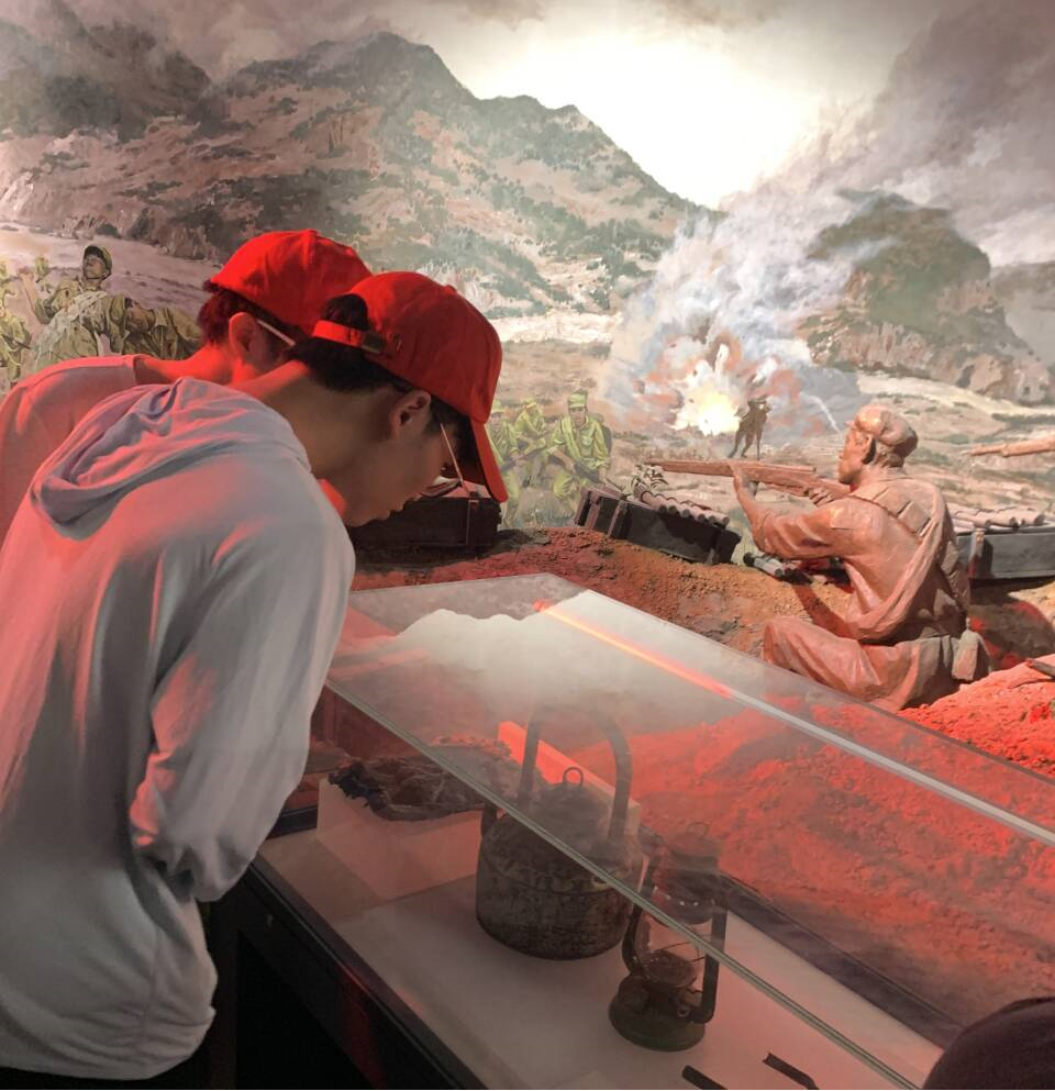 图为团队成员观看当时红军的行军队伍以及使用的物件。