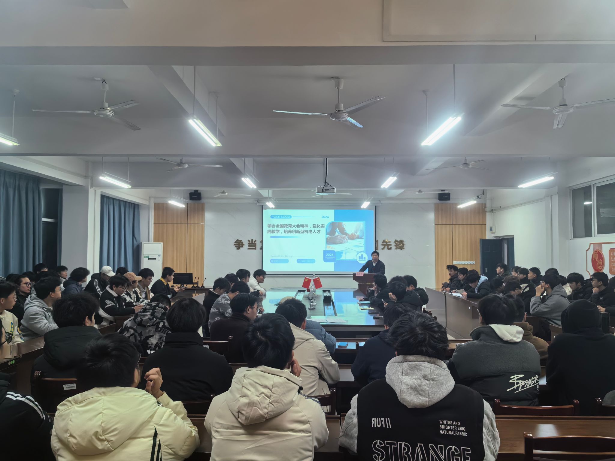 12月19日,在线买世界杯平台2024年秋季学期机电思政大讲堂第五讲在巡天楼229会议室开讲。学院分管教学工作副院长陈进武以“领会全国教育大会精神,强化实践教学,培养创新型机电人才”为主题开讲,学院100余名学生聆听。
