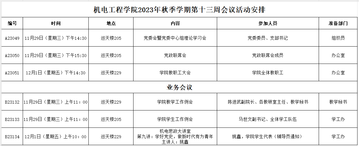 2023年秋季学期第十三周会议活动安排