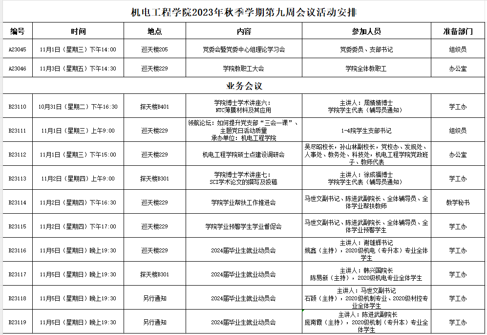 2023年秋季学期第九周会议活动安排
