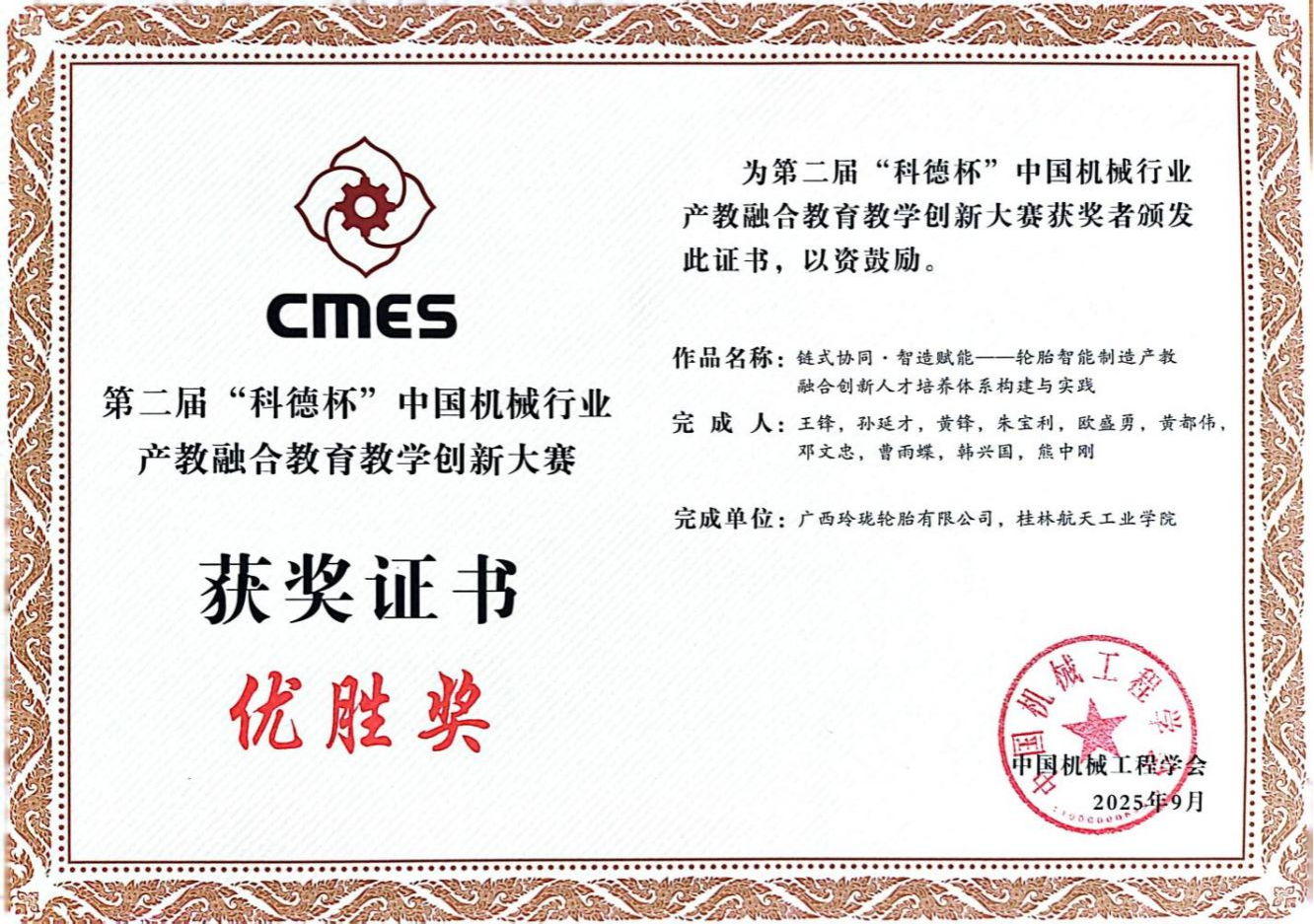 同期举行的第二届“科德杯”中国机械行业产教融合教育教学创新大赛中,与柳州玲珑轮胎有限公司联合申报的作品《链式协同·智造赋能——轮胎智能制造产教融合创新人才培养体系构建与实践》荣获企业组二等奖(优胜奖)。作品依托学院与广西玲珑共建的“非标智能装备与流程控制技术广西高校工程研究中心”,在智能制造装备、工艺流程控制和人才协同培养方面实现了创新突破。该项目紧密对接轮胎智能制造产业的发展需求,构建了“课程链—创新链—产业链”三链联动的育人体系,探索了通过校企联合推动课程改革、科研攻关与工程实践相结合的新路径。该成果不仅展示了桂航在产教融合领域取得的实际成效,也为地方产业链培育和行业人才培养提供了可推广的经验。