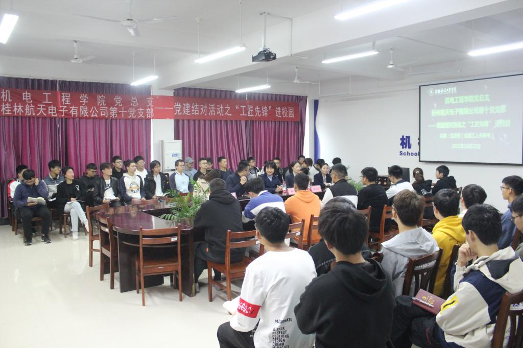 10月23日下午,在线买世界杯平台党总支和桂林航天电子有限公司第十党支部联合举办“航天工匠先锋进校园”主题讲座活动,活动在巡天楼205会议室举行。桂林航天电子有限公司第五党支部书记林媛,第十党支部委员王玲、“全国工人先锋号”绕线班组长沈正欢,学院团委书记、学生党支部书记及60余名学生代表参加活动。