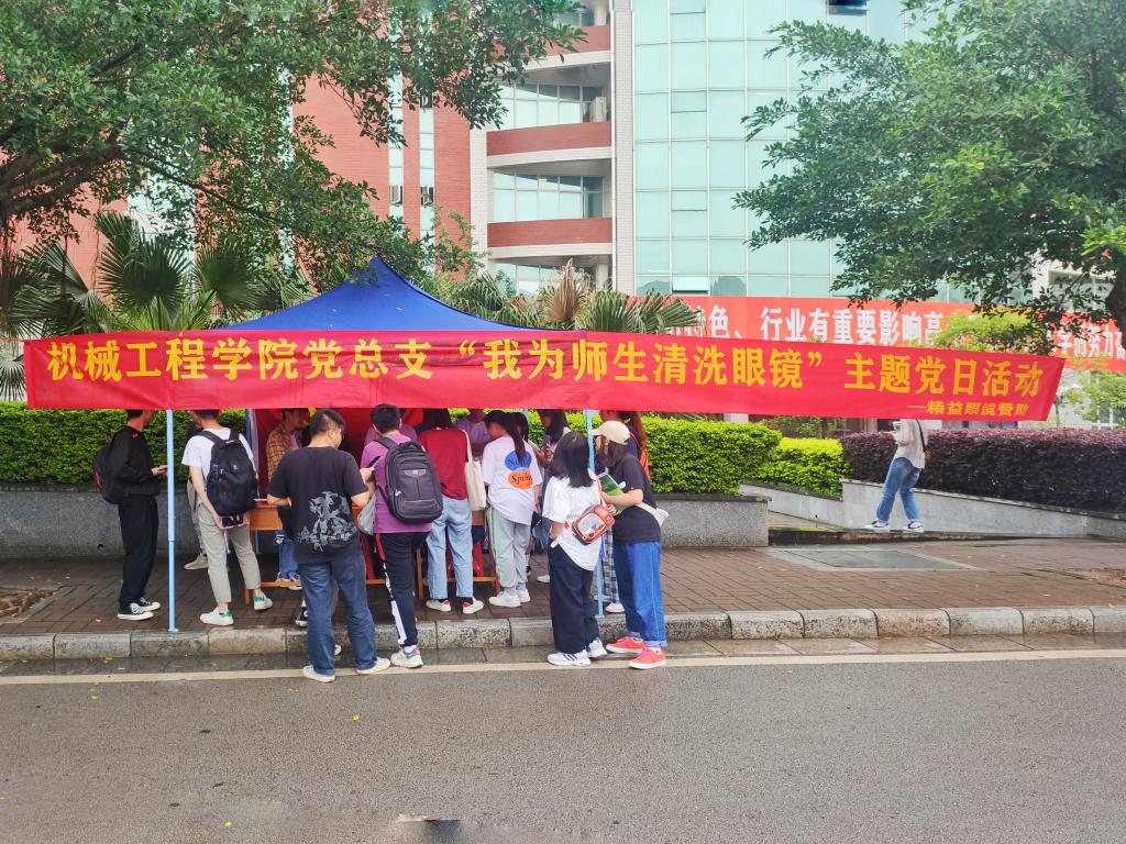 为庆祝中国共产党百年华诞,践行党史学习教育成果。5月6日,机械工程学院在学校南校区巡天楼前开展“我为师生清洗眼镜”主题党日活动。此次活动由机械工程学院党总支主办,党员事务服务中心承办,服务面向全校师生。