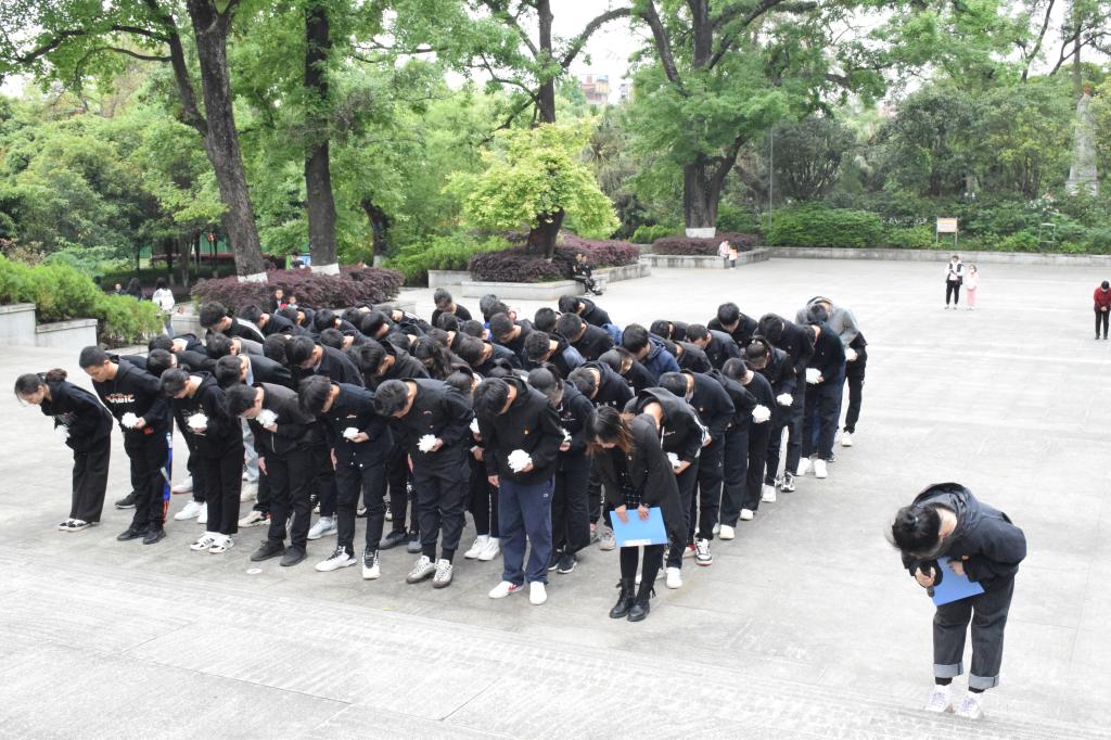 上午10:30分,师生们乘坐公交车来到桂林市七星公园烈士墓,举行庄严的扫墓仪式。在烈士碑前,大家重温中国共产党的百年光辉历程,了解为祖国抛头颅撒热血的革命先烈英勇事迹。在庄严肃穆的氛围中,全体人员在领誓员的带领下宣读誓词,怀着崇敬的心情向烈士纪念碑鞠躬、默哀三十秒,并向烈士敬献花圈和小白花,以此寄托对革命烈士们的深深敬意和无限哀思。
