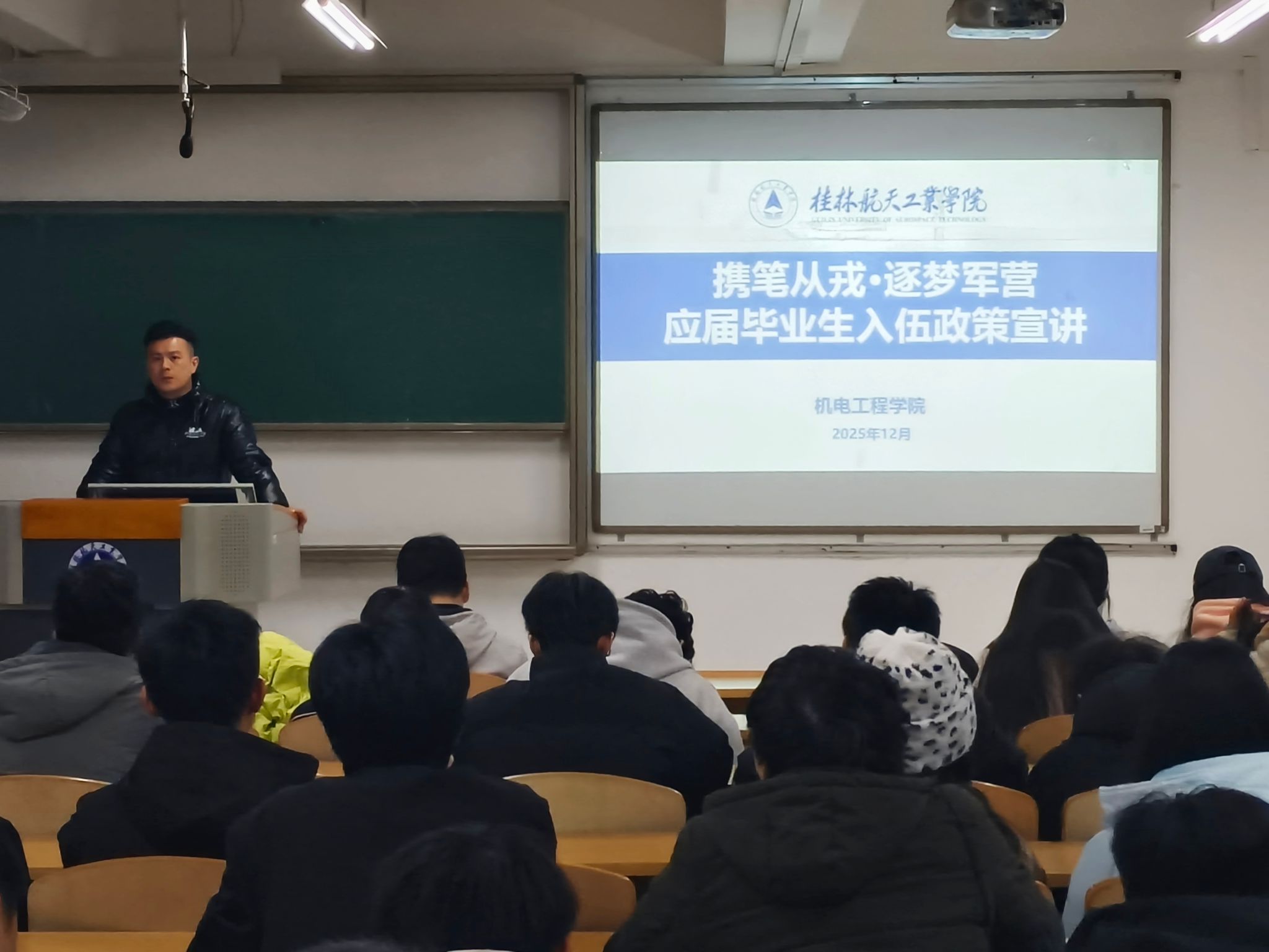 12月7日,在线买世界杯平台学生第四党支部在飞天楼208成功开展“携笔从戎·逐梦军营”应届毕业生入伍政策解读专题党课。支部书记陈老师以自身军旅经历为引,结合国家最新政策,为2026届应届毕业生带来一场既有温度又有深度的国防教育,现场座无虚席,150余名毕业生代表认真聆听。