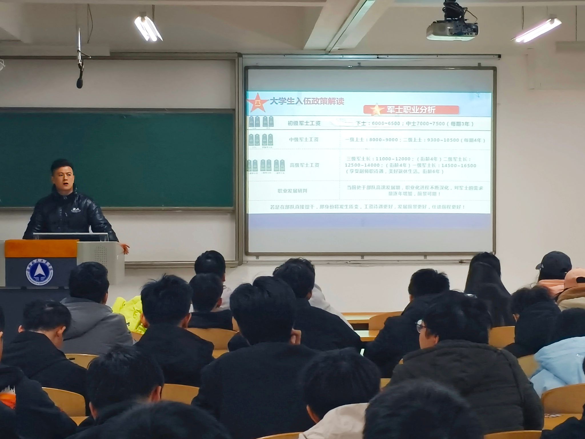 党课中,陈老师以“当兵后悔两年,不当兵后悔一辈子”开篇,深情回顾了自己从校园到军营的成长历程。他坦言军营生活虽艰苦,却锤炼了坚韧意志和家国情怀,“站岗放哨的寒夜、训练场上的汗水,都是青春最珍贵的勋章”,生动诠释了入伍经历对个人品质的磨砺价值和终身成长的深远意义。随后,他聚焦国家大学生入伍政策,系统解读了毕业生参军入伍的多重机遇:大学四年学龄计入军龄,转士官后优厚的退伍补贴可作为创业“第一桶金”,以及退伍后考研加分、考公专项计划等利好政策。“提干和考军校是改变人生轨迹的关键窗口”,陈老师强调,这些政策不仅为青年学子提供身份跃升的通道,更将个人理想融入强军伟业,为职业生涯奠定坚实基础。