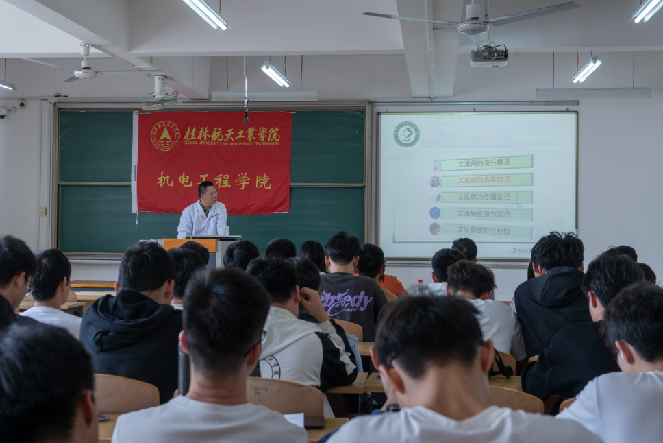 此外,桂林医学院黎雪桂老师以“艾滋病防控”为主题进行知识宣讲。他结合真实案例,就艾滋病的流行概况、临床特点、传播途径、检测与治疗、预防与控制等五个方面进行详细讲解,使同学们加深对艾滋病知识的正确认知,引导同学们正视、关注、有效预防艾滋病,秉持正确的生活态度,养成健康的生活方式。