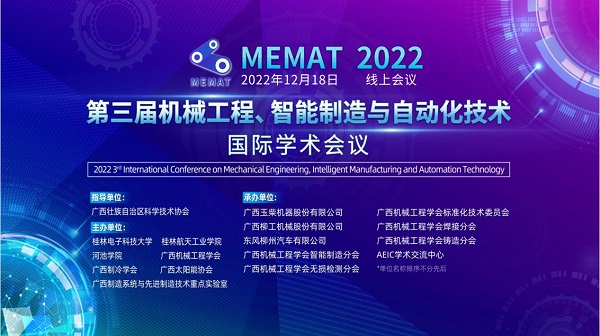 1218日,由广西壮族自治区科学技术协会指导,在广西机械工程学会的大力支持下,学校联合桂林电子科技大学、河池学院、广西制冷学会、广西太阳能协会、广西制造系统与先进制造技术重点实验室主办,AEIC学术交流中心承办的第三届机械工程、智能制造与自动化技术国际学术会(MEMAT2022)在线上顺利举行。广西机械工程学会理事长、桂林电子科技大学副校长潘开林出席会议并为大会致辞。会议由学会常务副理事长高兴宇主持。